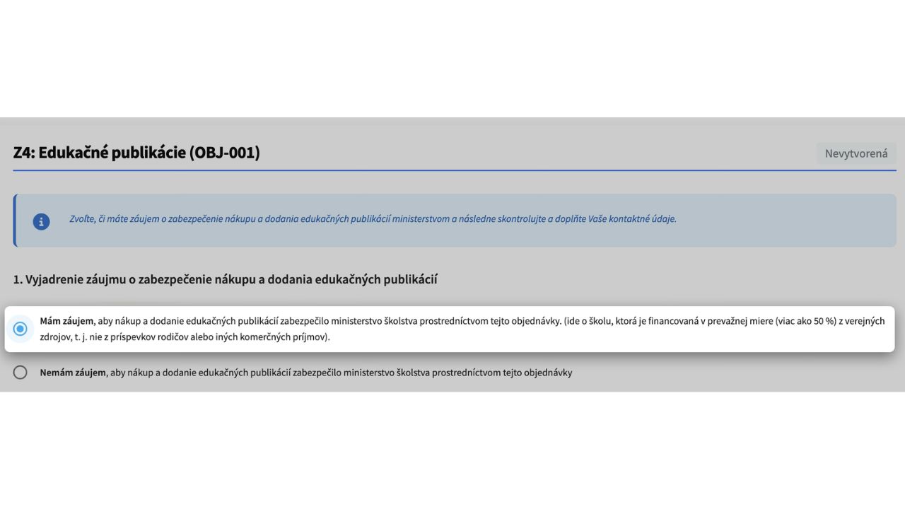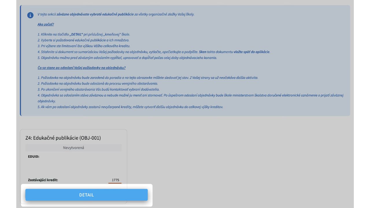 Ak ste vybrali všetky edukačné publikácie, tak musíte uložiť požiadavku a pripraviť objednávku, kliknutím na zelené tlačidlo ULOŽIŤ POŽIADAVKU A PRIPRAVIŤ OBJEDNÁVKU. Ďalej postupujte podľa pokynov portálu.